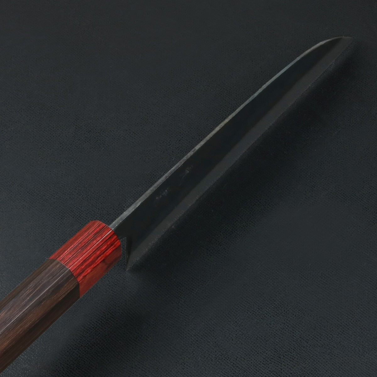 This chef's knife is fire-forged by one of Tosa's leading knife smiths. The cutting edge is made of Hitachi Yasugi's finest steel, Aogami Super. The thick steel is hammered and stretched during the fire-forging process, resulting in a dense structure.