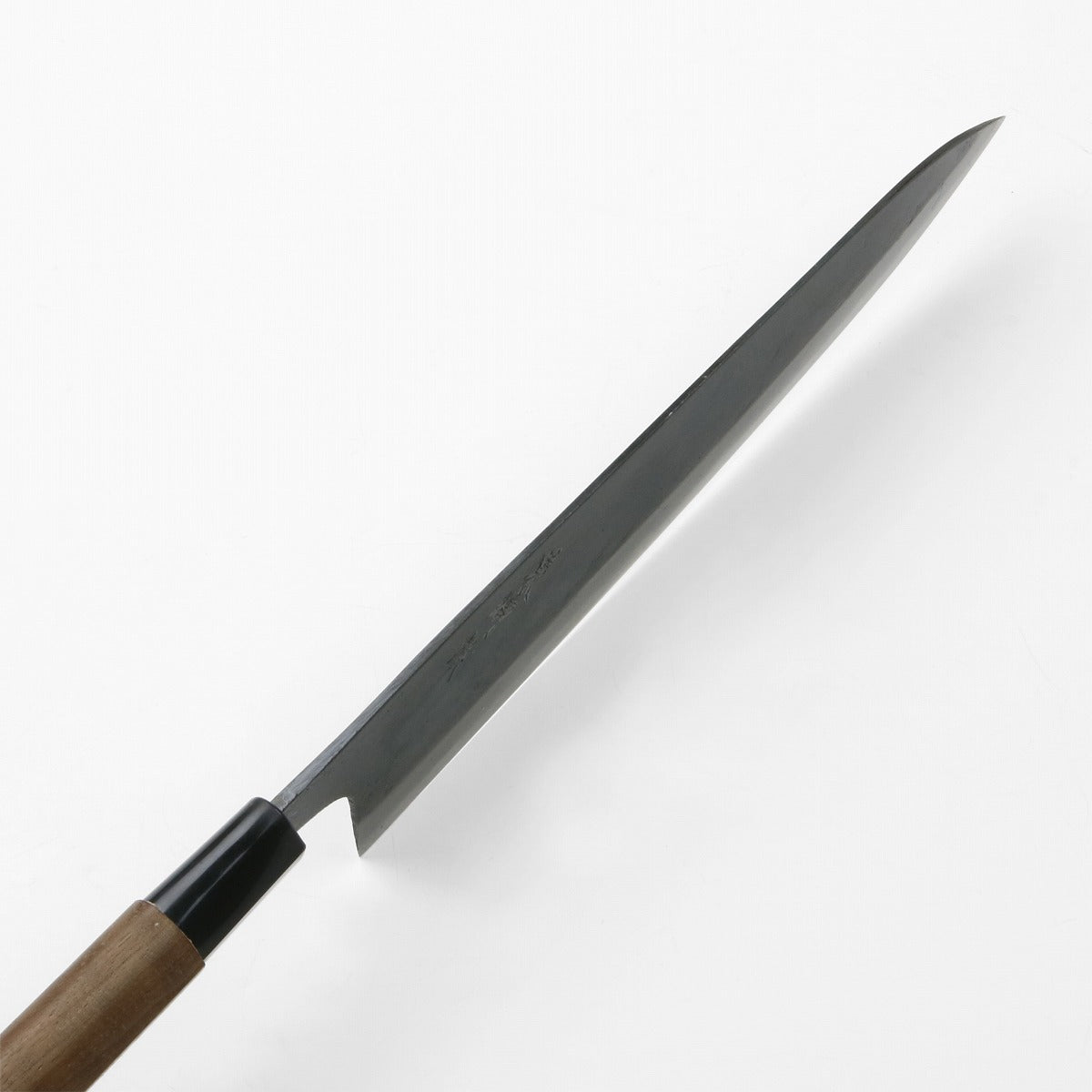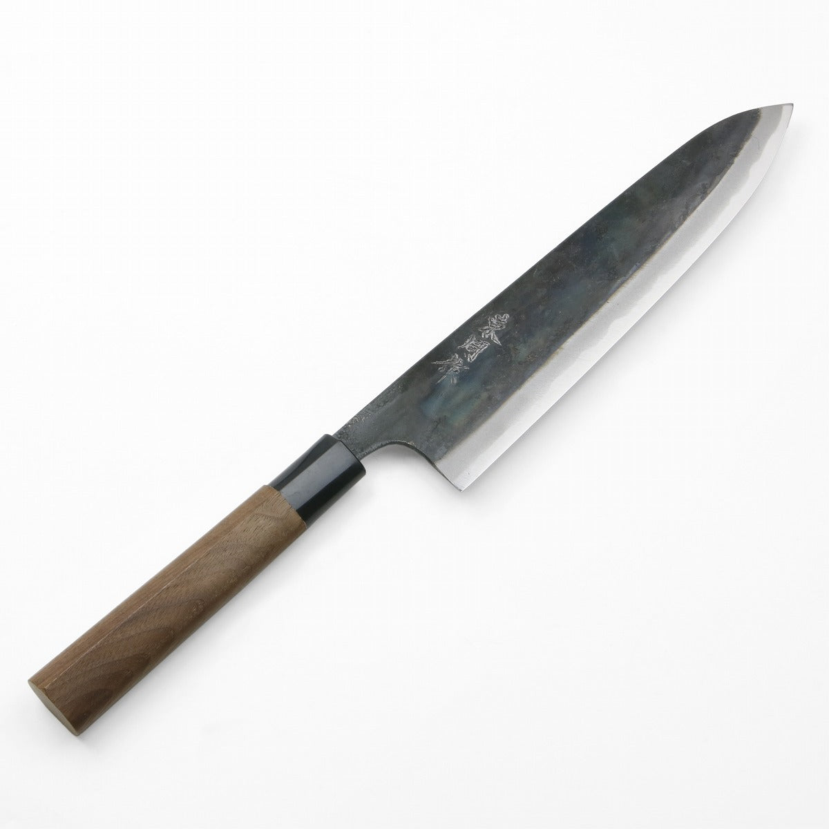 筋肉或纖維質多的食材也可完美切分。此外,如鐘擺般將刀柄和刀尖往復按壓,還可簡單地將蔬菜等食材切碎。採用高碳鋼的超青紙鋼,刀身是黑打鑄造,留下氧化鐵的覆蓋,可避免刀身生鏽的煩惱,達到「又鋒利又不怕生鏽」的目的, 外觀雖然不平滑, 但可以感受到鑄刀師傅的心血結晶。極致鋒利的刀刃,做到不破壞食材的纖維和養分。